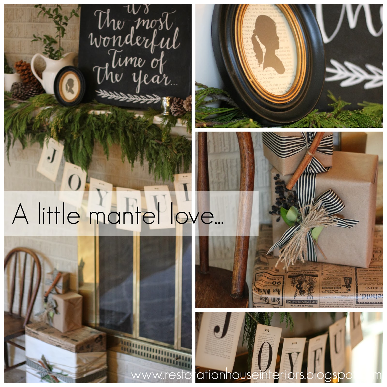 I wanted the mantel to have a bit of rustic charm but of course stick with the neutral palette. I just kept adding stuff at the last minute and that bookpage banner was a pain in the you know what mostly because of our printer malfunctioning but my wonderfully awesome hubby made it happen. I am happy with the results!